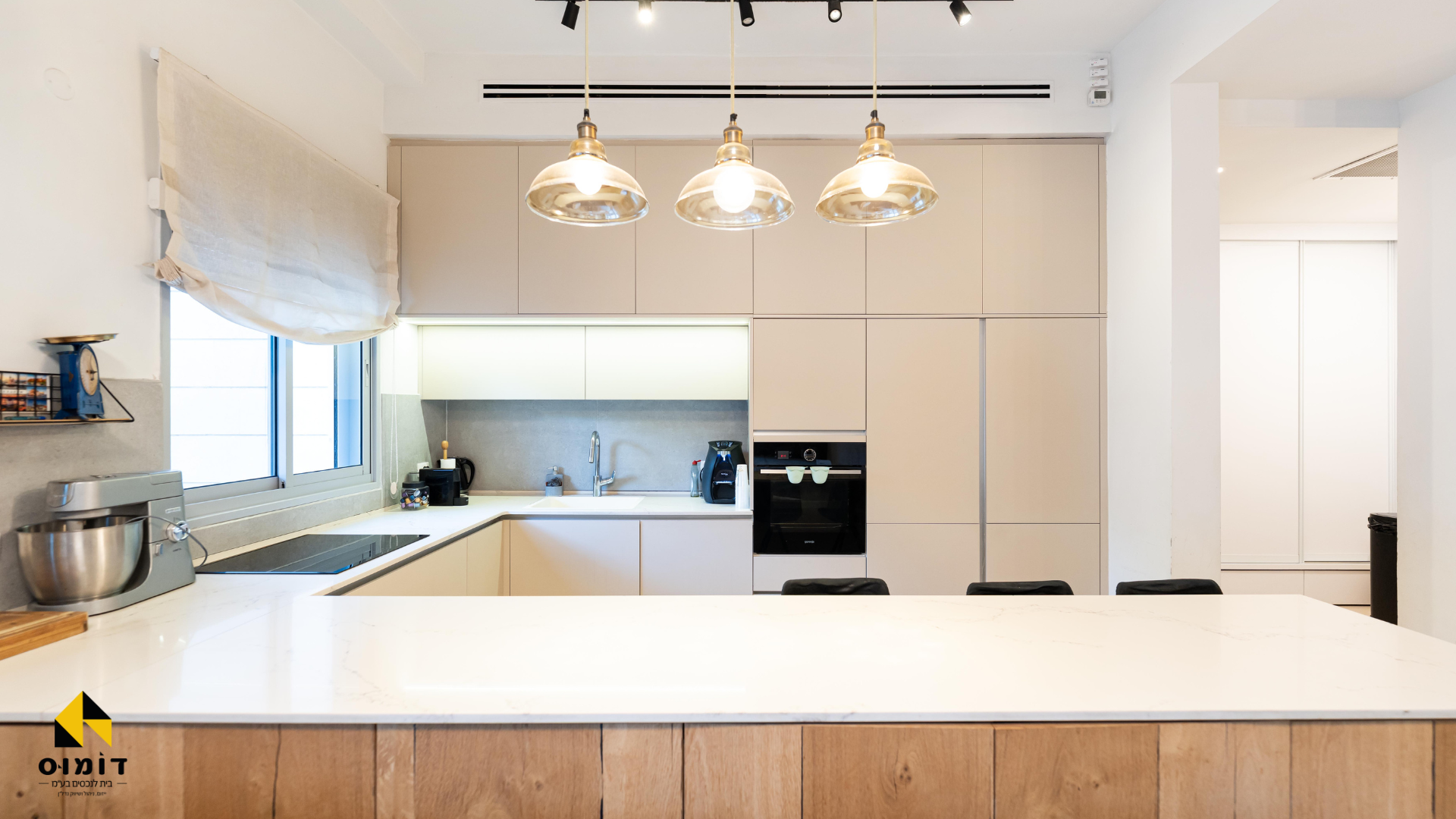 מטבח גדול של חברת אביבי + ארון מזווה ענק ואי במרכז.